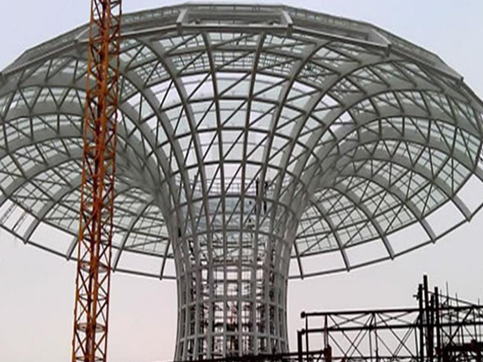 二、球形网架结构因其结构新颖,受力合理,自重轻、用钢量低等优点。如大型体育场馆球形保山螺栓球网架、公共场馆球形网架、电厂保山螺栓球网架、水泥工业球形网架、仓储物流球形网架、保山干煤棚工业球形网架、保山收费站保山加油站球形网架、展览中心、影剧院、商场、航站楼、候车厅、工厂保山车间、仓库、电视塔等球形螺栓球节点网架。国内球形网架结构主要分为:保山焊接球节点网架及螺栓球节点网架两种。螺栓球节点网架其构件工厂内加工量较大,现场安装便捷,适用于现场工期紧,保山施工条件、用电量受制约,网架形状复杂、保山杆件定位困难的异形结构。螺栓球节点球形网架系统基本由保山杆件、螺栓球、支撑支座等组成。按照节点形式可分为交叉保山桁架体系、四角锥体系、三角锥体系等。支撑方式多为固定支座支撑。对于大面积、大跨度及有特殊受力或伸缩要求的网架结构可采用橡胶支座、滑移支座、球铰支座等支撑形式,以满足结构自身的受力稳定、均衡,便于内力释放等设计要求。